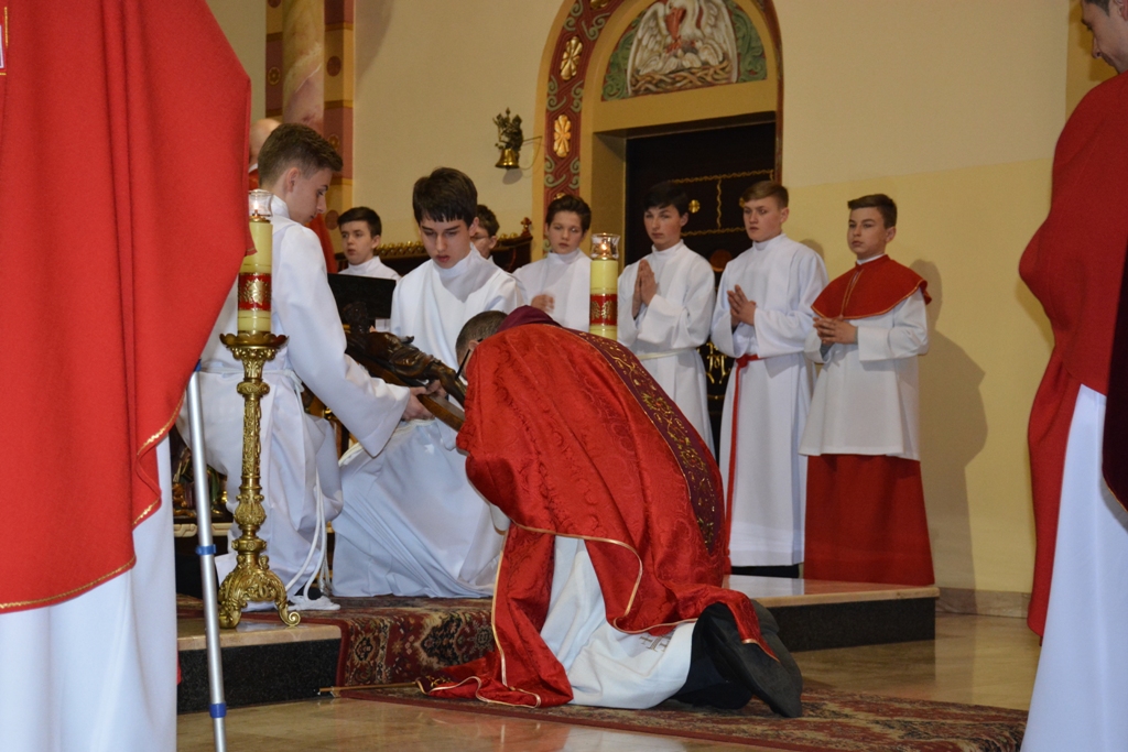 W Wielki Piątek: adoracja przy Bożym Grobie od godz. 8.00 do 17.30. O 17.30 – Droga Krzyżowa, a po niej – Liturgia na cześć Męki Pańskiej. Po Liturgii – przeniesienie Najświętszego Sakramentu do Bożego Grobu i adoracja do godz. 22.00 (od 19.30 do 20.30 – Seniorzy; od 21.00 do 22.00 – młodzież. W tym dniu obowiązuje post ścisły. Zaleca się zachowanie postu od pokarmów mięsnych aż do Wigilii Paschalnej w Wielką Sobotę. Kolekta w Wielki Piątek – na utrzymanie Bożego Grobu w Jerozolimie i kościołów w Ziemi Świętej. W Wielki Piątek rozpoczyna się Nowenna do Miłosierdzia Bożego przed Świętem Bożego Miłosierdzia.
